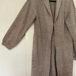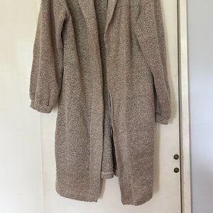 Just past the knees (5'2) baggy sleeves, pockets. Never worn excellent condition, no pulls, frays. Marled knit Size Medium loose fitting