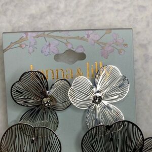 Elegant floral earrings with silver tone accents. Perfect for any occasion.