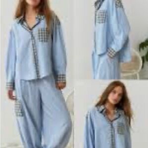 Cozy and stylish pajama set featuring blue and brown stripes. Perfect for a comfortable night's sleep.