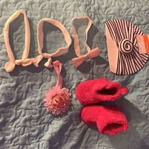 towels, bibs, wash cloths, burp burp cloths, head bands, boots, hat