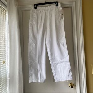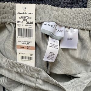 New with tags! Lot of 2 pairs of women’s size 12 petite pants. The first pair of Studio Works pants are white, wide leg style. The second pair of Alfred Dunner pants are a soft gray corduroy, wide leg style. Both have elastic waist.