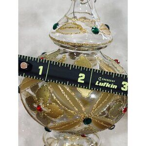 Unique lot of 3 Glass Christmas Finial Ornaments Hand Blown + Painted Gold rhinestones. red & green. These ornaments are so fancy, even the Christmas tree feels underdressed. Deck the halls with these hand-painted, sparkly gems that scream, "I'm festive!"