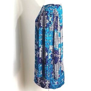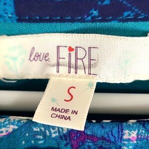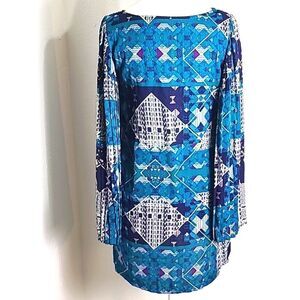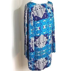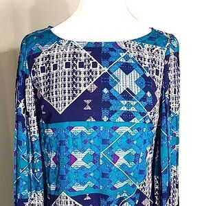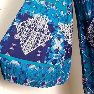 love FIRE Teal, Navy Blue & White Boho Dress, Wide Pleated Longsleeves, Sz Small