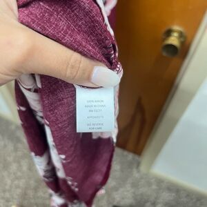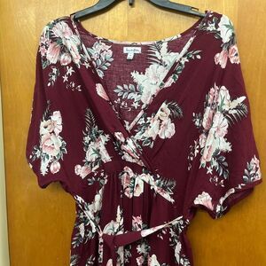 Chic burgundy maxi dress with floral design. Features short sleeves and a wrap style. Ideal for casual or dressy events.