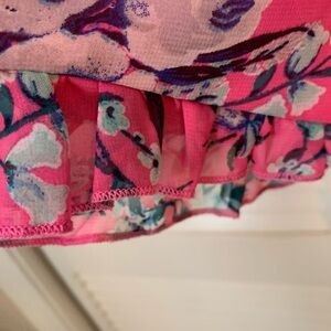 Chic pink romper, with floral pattern. Features long sleeves and a beautiful ruffle trim. Perfect for any occasion. 100% polyester