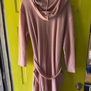 Cozy ribbed robe with hood. Features a tie belt and pockets. Perfect for lounging.