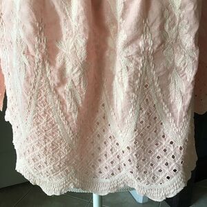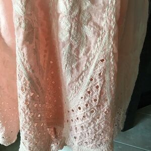 Very pretty eyelet detailing and embroidery throughout. Coral pink. Ruched neckline, 3/4 sleeve. Flattering length. Great with denim.