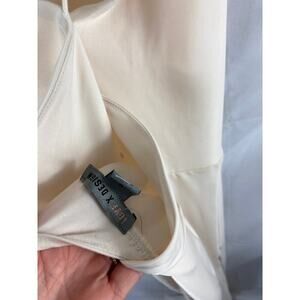 worn once, bottom has wear spots and a few spots on body, small makeup mark on neckline could be washed out