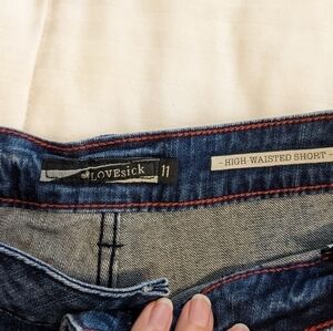 Lovesick High waisted cutoff jean shorts size 11. The fly is half button and half zipper. 2 front pockets and 2 back pockets. the waist measurement is 15 inches, the rise is 10 inches and the inseam is 5 inches. A classic pair of shorts.