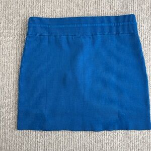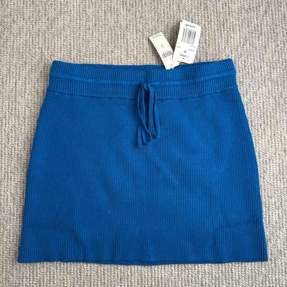 Ribbed knit mini skirt with drawstring waist. Stretchy fabric contours the body. Clean straight hem for a neat finish. Vibrant cobalt blue shade. New with tags!