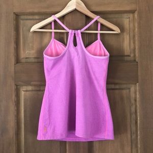 Racerback tank Built in bra with pads - great support Cinched front chest detail - very flattering Gently used condition Heathered pink in color