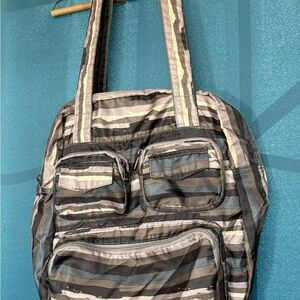 Stylish tote bag with a striped pattern. Features multiple pockets for convenience. Perfect for everyday use.