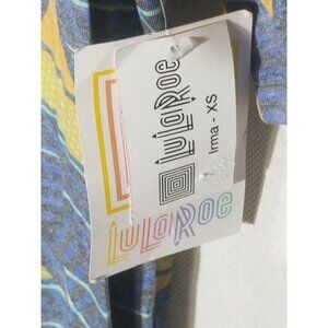 This Lularoe Irma tunic features a vibrant geometric pattern in blue, orange, and yellow. Made from a polyester and cotton blend, it is size XS and new with tags. The tunic measures 27" in height and 24" in bust.