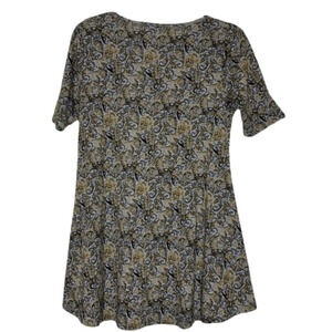 LuLaRoe Perfect T in a yellow and black pattern on a gray background. The Perfect T features a scoop neck, short sleeves and flared bodice with slits on each side. Very flattering style! Size XXS fits 0-6. NWOT.