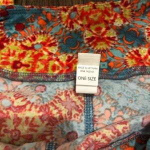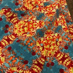 Buttery soft LuLaRoe OS (One Size) Leggings featuring a vibrant kaleidoscope or geometric print. The colors include teal/turquoise, bright orange, red, and yellow, creating a fun, bold pattern. LuLaRoe's One Size typically fits women's sizes 2-10. These are an iconic and comfortable staple for casual wear, lounging, or activewear.