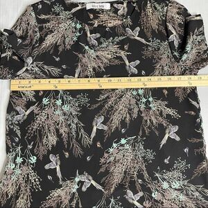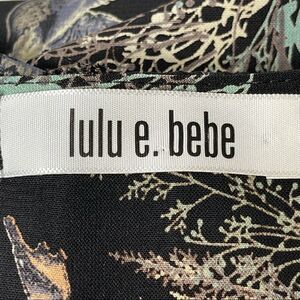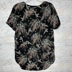 lulu e. bebe Silky Black With Floral Bird Print Short Sleeve Top Size Small