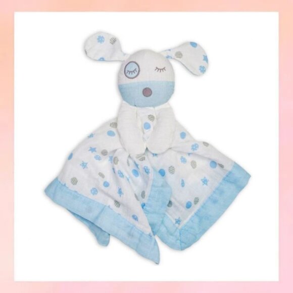 Blue puppy lovey is a comforting, huggable muslin cuddle toy