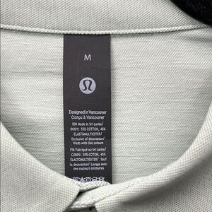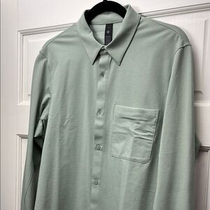 This never used casual button down shirt from Lululemon features a soft muted sage green color that offers a calm and understated appearance. The lightweight fabric is likely a cotton or linen blend, providing comfort and breathability for everyday wear.