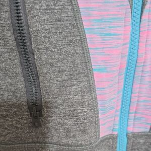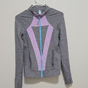 This stylish pink and gray long sleeve hoodie features a fitted design with a zippered front and a mandarin collar. The contemporary geometric pattern adds a unique touch, making it perfect for both athletic and casual occasions. Crafted from a stretchy and breathable fabric, it ensures comfort and flexibility for any activity. great pre-owned condition.