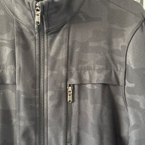 Lightweight full-zip jacket from lululemon in a subtle tonal black camo pattern. Made with their signature Luon fabric for a soft, stretchy feel with great shape retention.