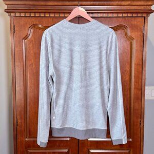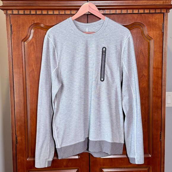 lululemon men’s crewneck pullover sweatshirt in a light heather gray micro-stripe texture with darker gray ribbed cuffs and hem. Features a vertical zip chest pocket for secure storage and a subtle lululemon logo at the lower back hem. Great athleisure layer for gym warm-ups, travel, weekend wear, and casual street style. Tag removed, but size is either a medium or a large--please see photos/measurements.