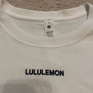 This is a white t shirt with black name embroidery from lululemon in a size 10. This has been worn a couple of times and is in great condition!