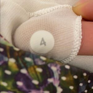 Excellent used condition Lululemon “running in the city” tank top. Size 4. Built in bra and bra cups with mesh venting on the back for comfort while you sweat. Green and purple polka dot floral print.