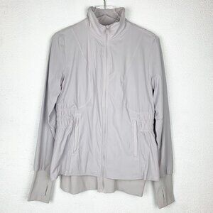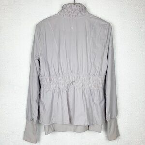 Sights seen jacket in chrome by lululemon. Swift material. Soft microfleece inner lining. Two front zippered pockets. Thumbholes. Cinchable waist. High neck. Back peplum design. Some minor surface dirt on cuffs and along neckline, see last three photos. Looks like it'll lift with some treatment.