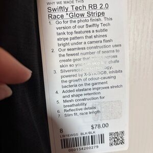 lululemon Swiftly Tech RB 2.0 Race Glow Stripe Size 8 NWT, Black, Subtle stripe pattern that shines bright under a camera flash, seamless construction uses the fewest number of seams to create gear that glides across skin so you can skip the chafe. Silverscent technology powered by X-STATIC inhibits the growth of odour-causing bacteria on the garment, slim fit, race length