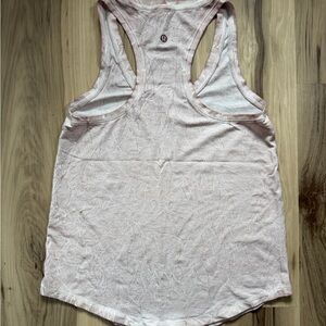 Classic Lululemon Razorback tank with a pattern that resembles marble in a light pink color. I’m unsure if the size is extra small or small, so I set the size as extra small. I am a small and it fits more fitted while an extra small would be draped a bit