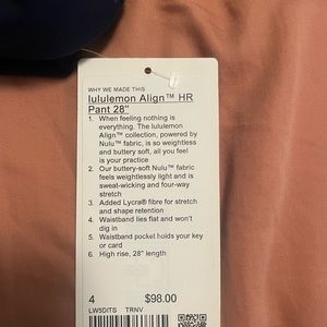align high rise leggings inseam is 28” and size 4. brand new comes with tags and bag bought in