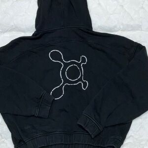 Stylish black hoodie with unique back design. Comfortable and versatile.