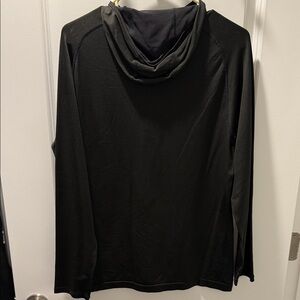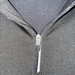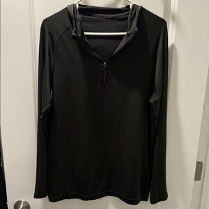 Sleek black lightweight jacket. Features a half-zip design. Perfect for working out.