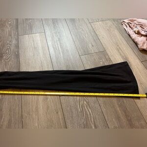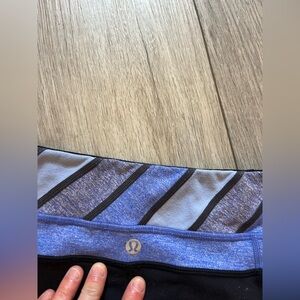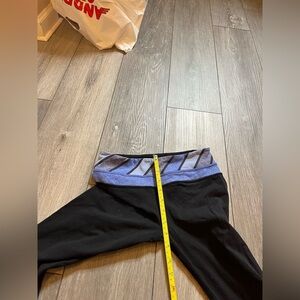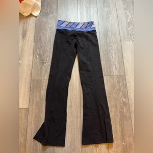 Stylish black yoga leggings with a blue waistband. Perfect for workouts or casual wear. Comfortable and flexible fit. Groove flare.