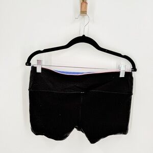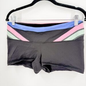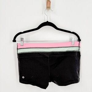These athletic shorts from lululemon athletica feature a sleek design in black and pink, perfect for active pursuits. Made from a stretchy, breathable material, they offer comfort and flexibility for any workout. The modern color-blocked style adds a touch of contemporary flair to your athletic wardrobe.