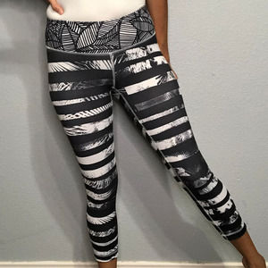 Stylish black and white striped leggings. Perfect for workouts or casual wear. Comfortable and flexible fit.