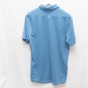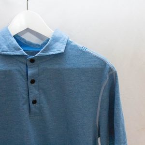 Stylish blue polo shirt. Features button-up collar. Perfect for casual wear.