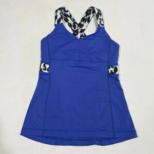 Stylish blue tank top. Features patterned straps. Perfect for workouts.