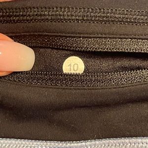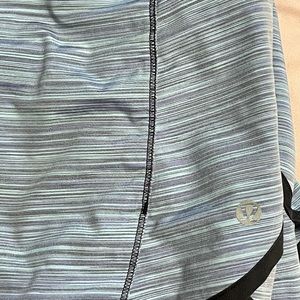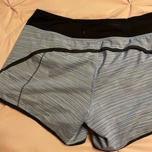 Stylish athletic shorts by lululemon athletica. Features a black waistband and gray striped pattern. Perfect for workouts.