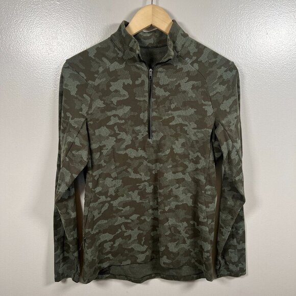 Stylish long sleeve shirt with a camouflage pattern. Features a half-zip design. Perfect for casual wear.