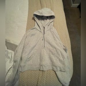 Cozy gray hoodie with half-zip. Features front pocket and hood.