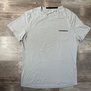 Comfortable short sleeve tee. Features a subtle V-neck and chest pocket. Ideal for casual wear.