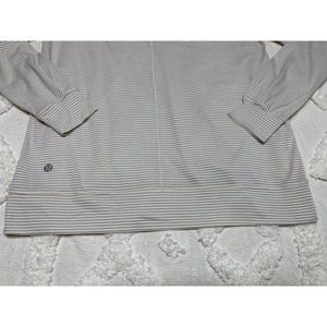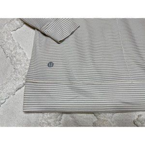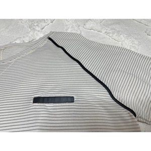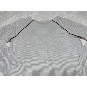 Stylish gray striped long sleeve tee. Features black accents. Comfortable and versatile.