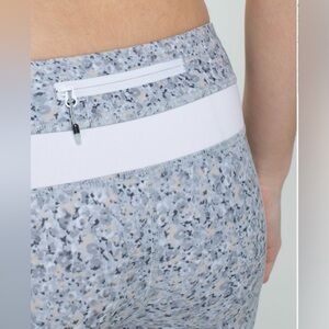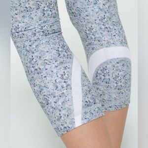 Stylish gray leggings with white accents. Perfect for workouts. Comfortable fit.