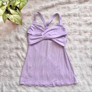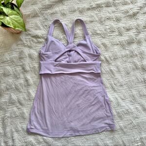 Stylish lavender tank top. Features cross-back design. Perfect for workouts or casual wear.