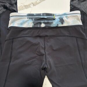 Lululemon Athletica Comfortable black leggings with a stylish blue waistband. Ideal for active wear, yoga, running or casual wear. No side pockets. Zipper rear pocket. Comfortable wear. Size 6
