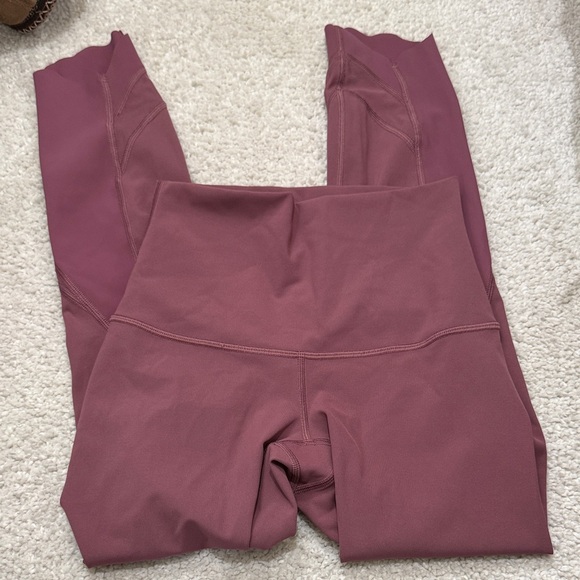 High-waisted mauve leggings. Seam detailing for style. Perfect for workouts or casual wear.