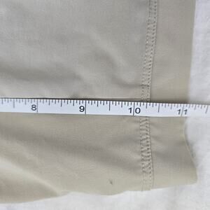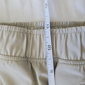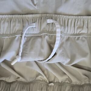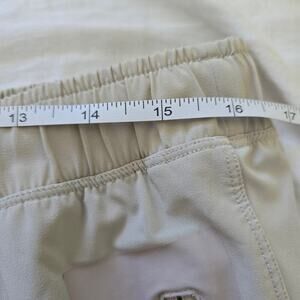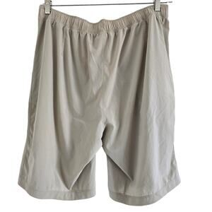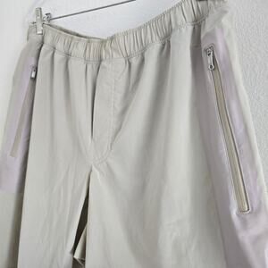 Cream athletic shorts. Elastic waistband. Zippered side pockets.