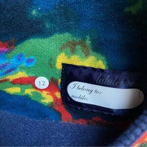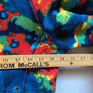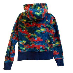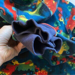 Vibrant multicolor jacket with a bold pattern. Features a full zip and hood. Perfect for a stylish look.