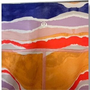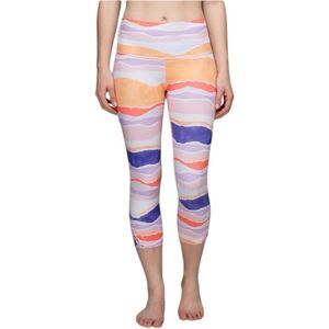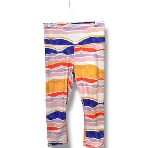 Vibrant leggings with a multicolor pattern. Features shades of purple, orange, and pink. Perfect for active wear.